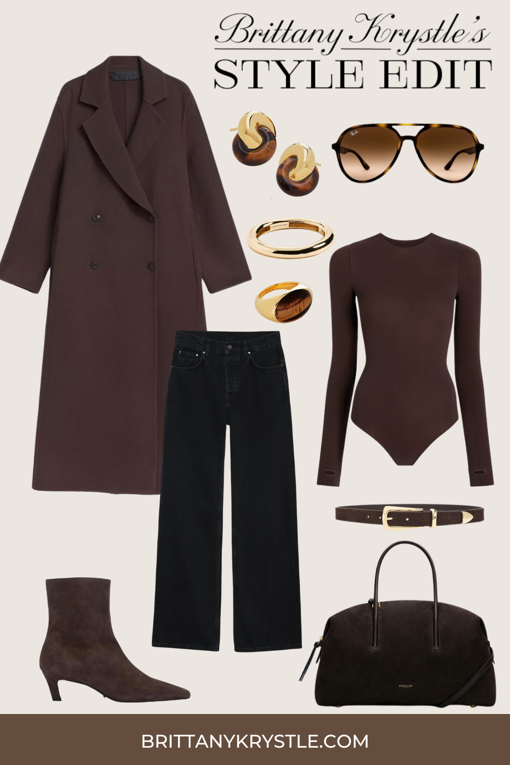 Brown Coats | Brown Long Sleeve Tops | Black Jeans | Belts & Boots | Handbags | Jewelry | Accessories
